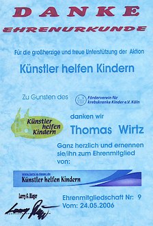 Seit Bestehen unterstütze ich sehr gerne mit meinen Auftritten den Förderverein für krebskranke Kinder e.V. Köln. Dieser Verein ist entstanden aus einer unabhängigen Initiative von Eltern, deren Kind an Krebs erkrankt war oder ist. Ziel des Vereins ist es, die Lebenssituation und das Umfeld der kranken Kinder sowie ihrer Familien zu verbessern. Leider bekommt der Verein keinerlei Zuschüsse und wird ausschließlich aus Spenden und Beiträgen finanziert. Zu diesem Zweck gründete Moderator Larry G. Rieger die Aktion "KÜNSTLER HELFEN KINDERN", zu der alle zwei Monate in Köln und Umland eine Show mit Talk und Musik stattfindet und in der ich immer mal wieder zu Gast bin. Desweiteren sind bisher einige CD-Sampler mit allen teilnehmenden Künstlern und Paten der Aktion erschienen. Seit dem 24.05.06 gehöre ich auch zu den Ehrenmitgliedern von KHK. Ausführliche Infos über KHK sowie die nächsten Veranstaltungen gibt's hier : www.larry-g-rieger.de | |||||||||||||||||||||||||||||||||||||||||||||||||||||||||||||||||||||||||||||||||||||||||||||||||||||